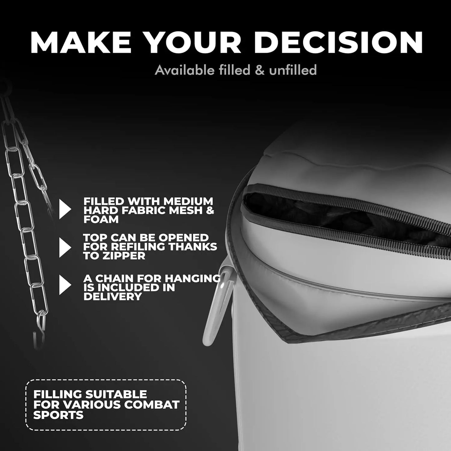 - 【UNFILLED】for your own filling at home. Here you can reach a weight of up to 50 kg with e.g. rubber granult. The chain and the swivel is part of the set.