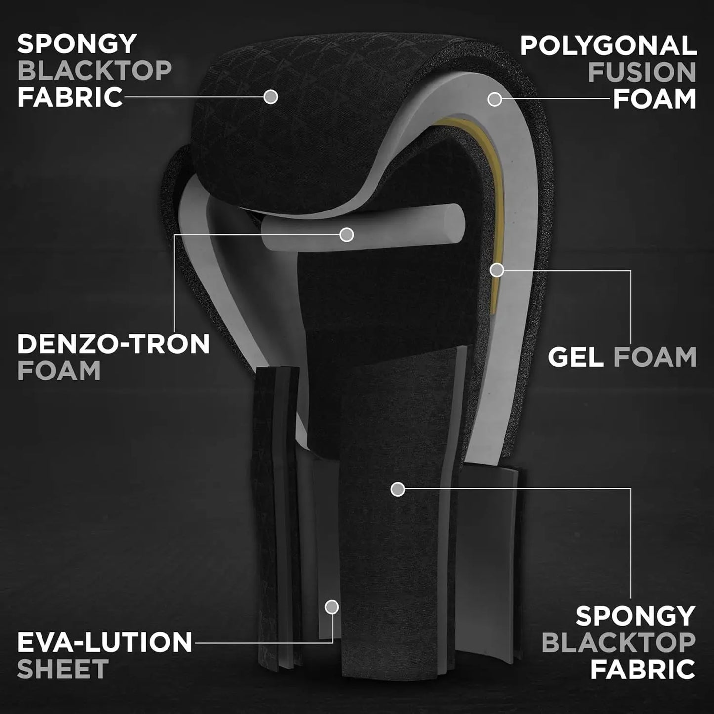 - MULTILAYERED PADDING—The sparring gloves have a combination of Spongey Blacktop Fabric, Polygonal Fusion Foam, EVA-solution sheet, and Gel Foam. This allows the boxing training gloves to diffuse the impact force effectivelEVA-solution duringng training.