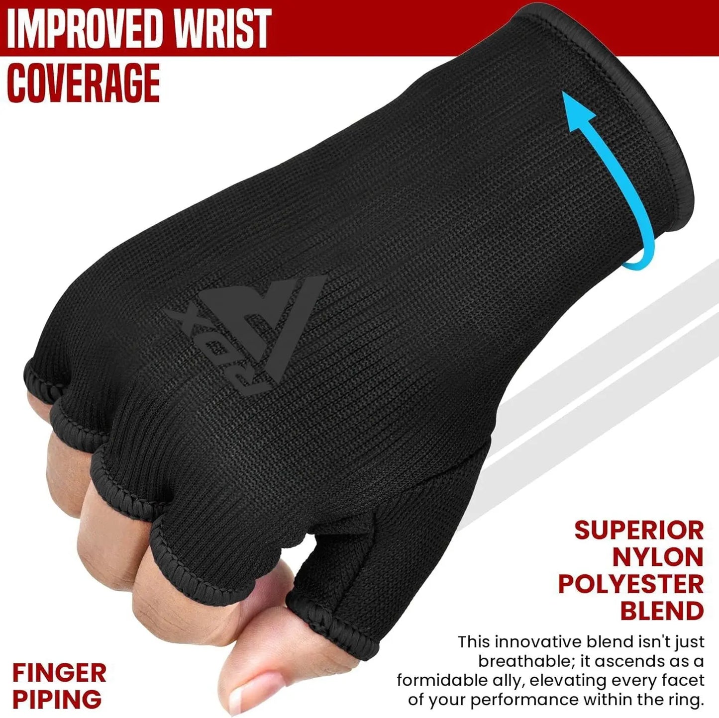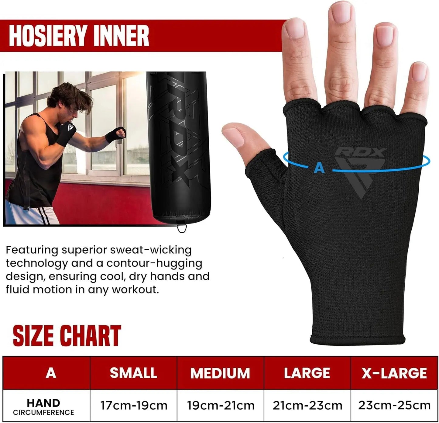 - DEFEND WITH CONFIDENCE – Looking for something to keep your glove from sliding around? You're looking in the right place. That’s what RDX inner gloves bring to the table. They seamlessly fit beneath your boxing gloves, offering an additional layer during your intense MMA, Boxing, Muay Thai, or Kickboxing sessions. Imagine a secret buffer woven right into your inner boxing glove helping your punches land hard.