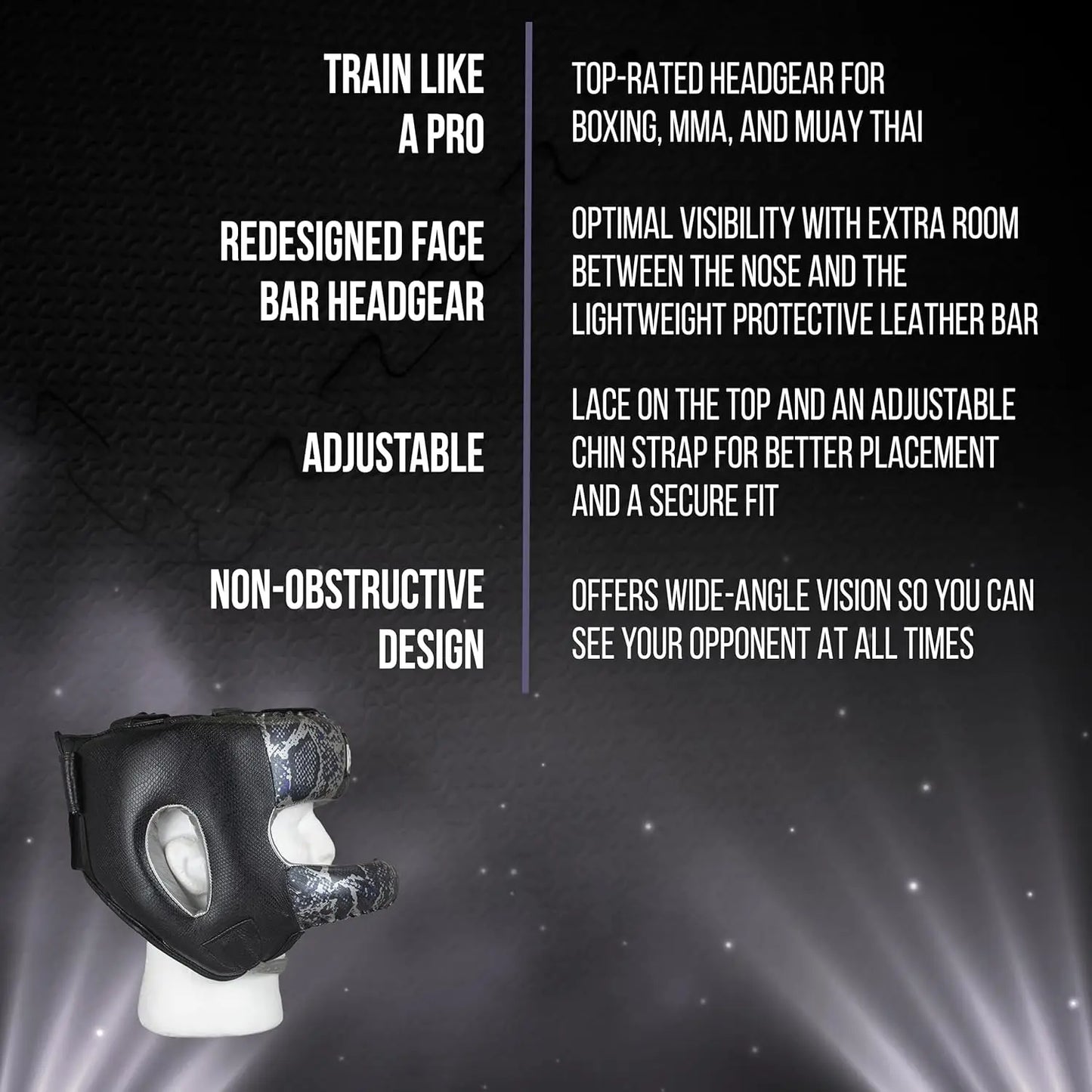 - REDISCOVER THE ART OF BOXING WITH OUR REDESIGNED FACE BAR HEADGEAR - New Steel Snake Collection, inspired by the viper texture. The 3-point anatomical design offers optimal visibility with extra room between the nose and the lightweight protective leather bar.