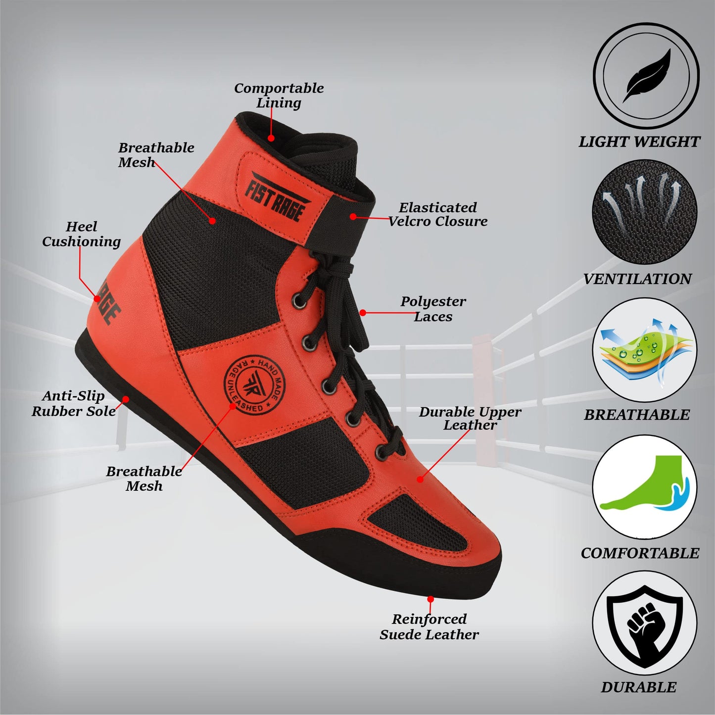 - These Boxing Shoes deliver an agile performance and breathable mesh upper along with an anti-slip rubber sole that provides adhesion and firm grip, helping you to move freely around the ring.