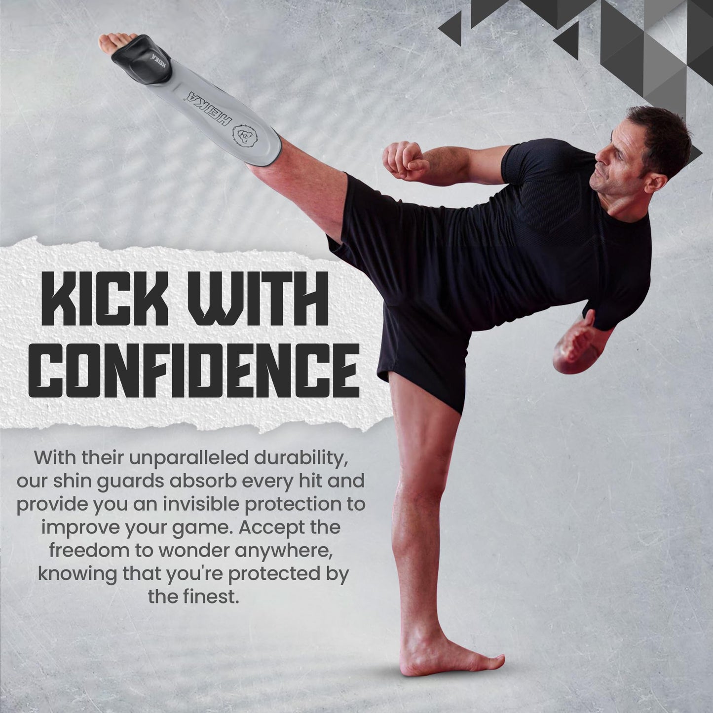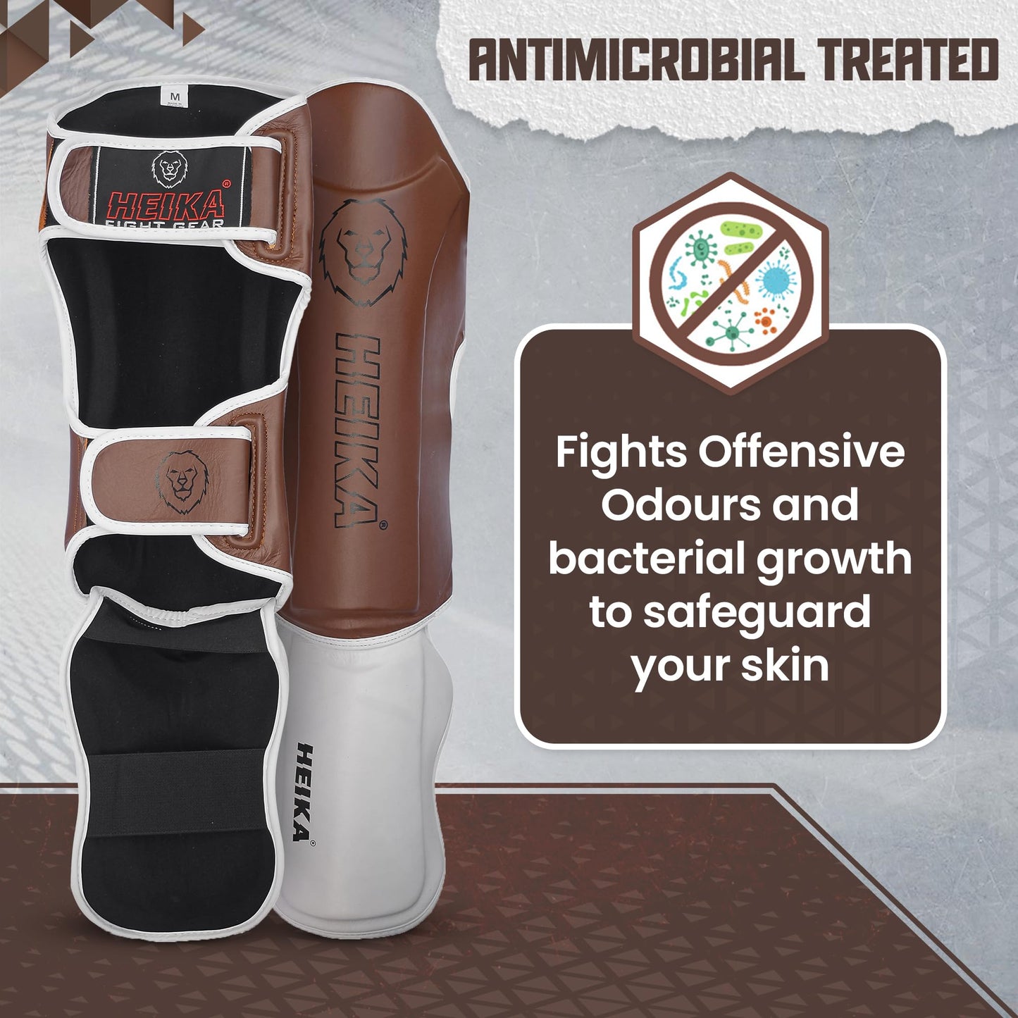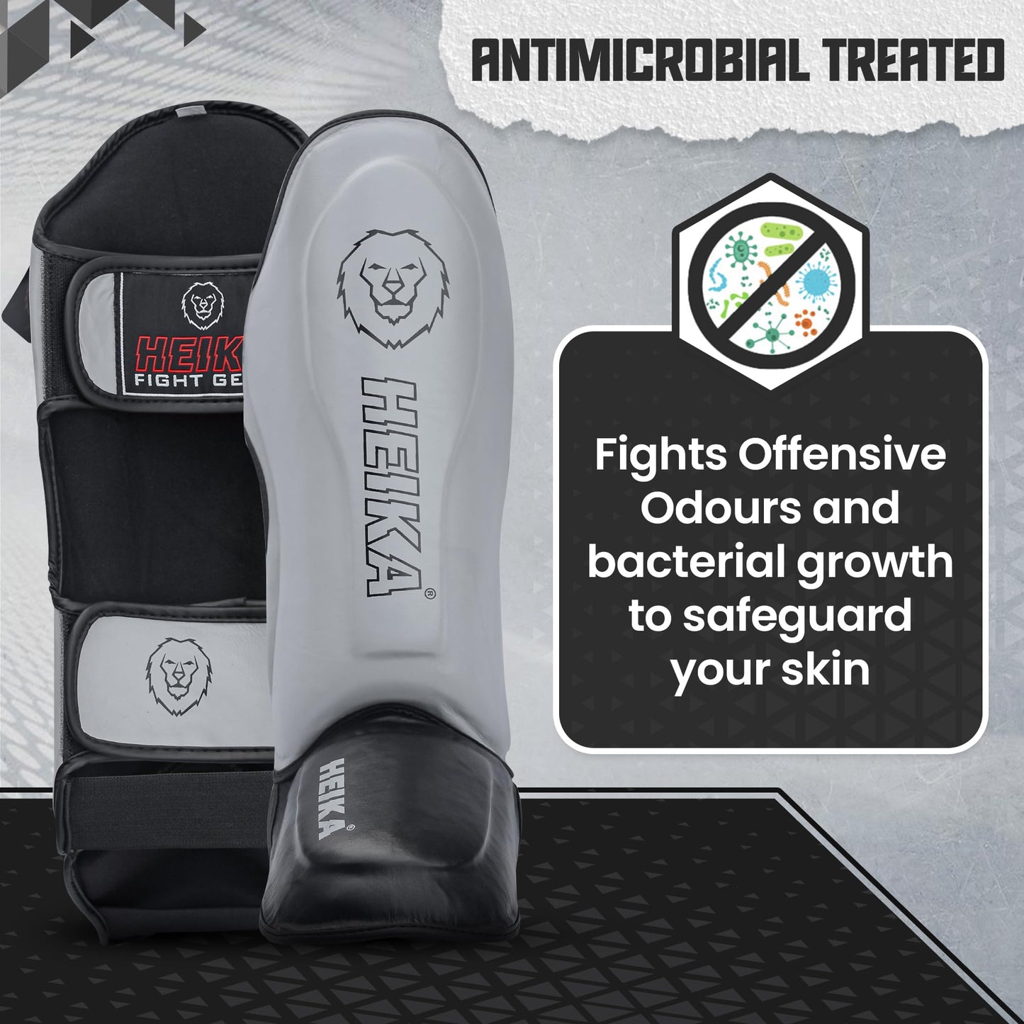 - Heika’s Shin Guards are created with high strength cowhide leather, which helps reduce impact on leg bones and muscle efficiently; the shin guards' EVA backing for high comfort and durable cushioning. Muay Thai boxing shin guards provide all round usage in sports such as kickboxing, MMA, fighting, fitness, training, etc. The advanced technologically is used to create ventilation in these shin pads for MMA. This helps create a sweat-free experience for novice athletes