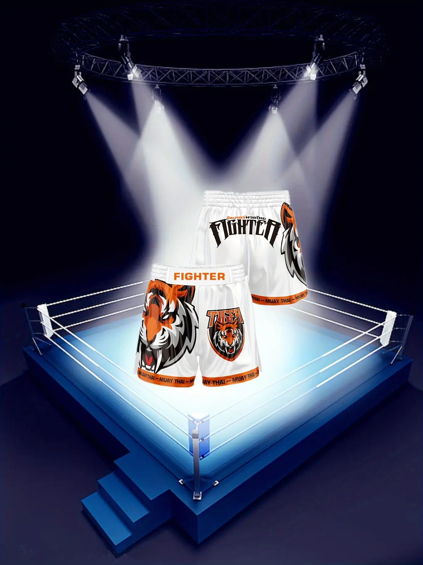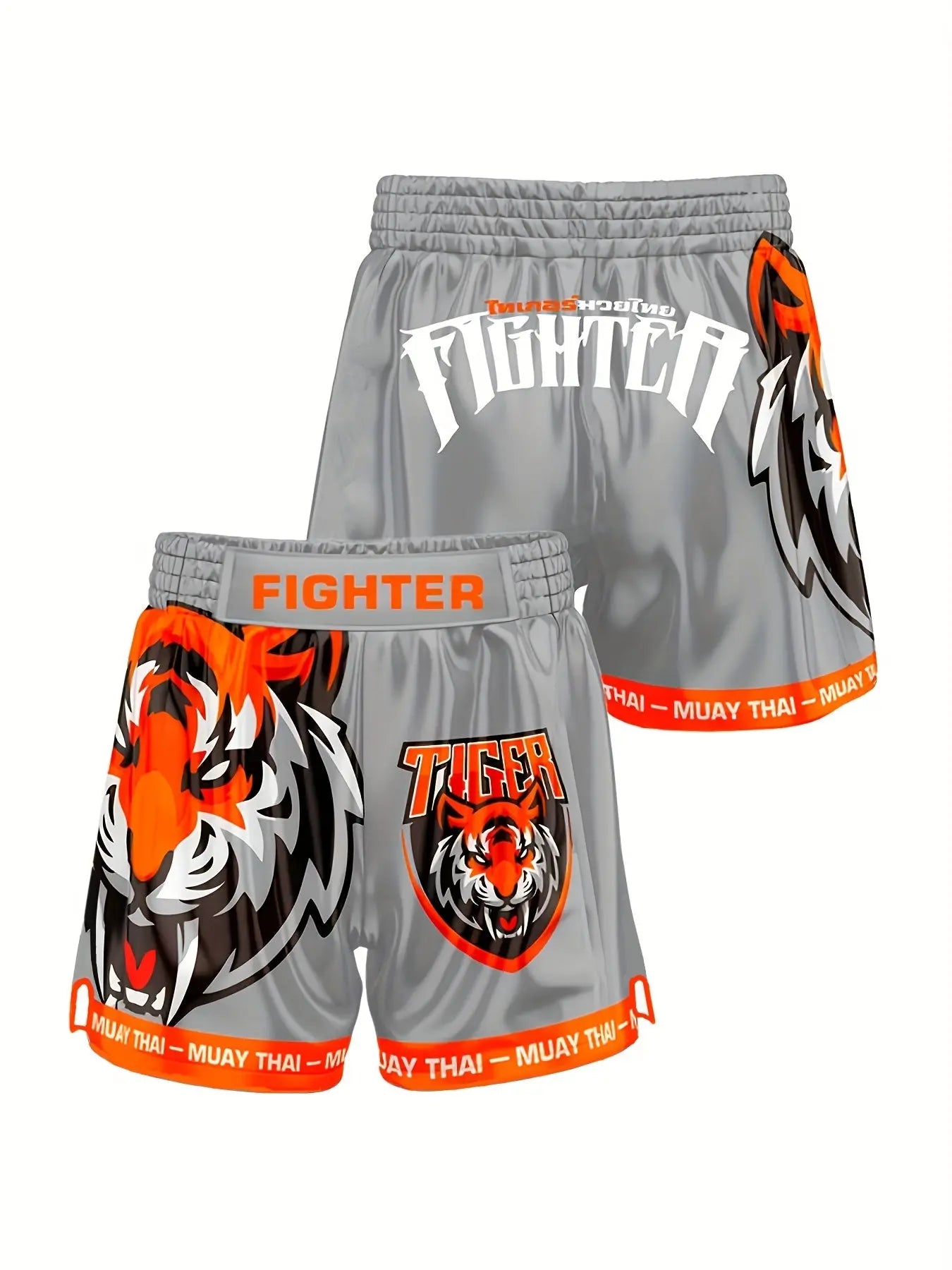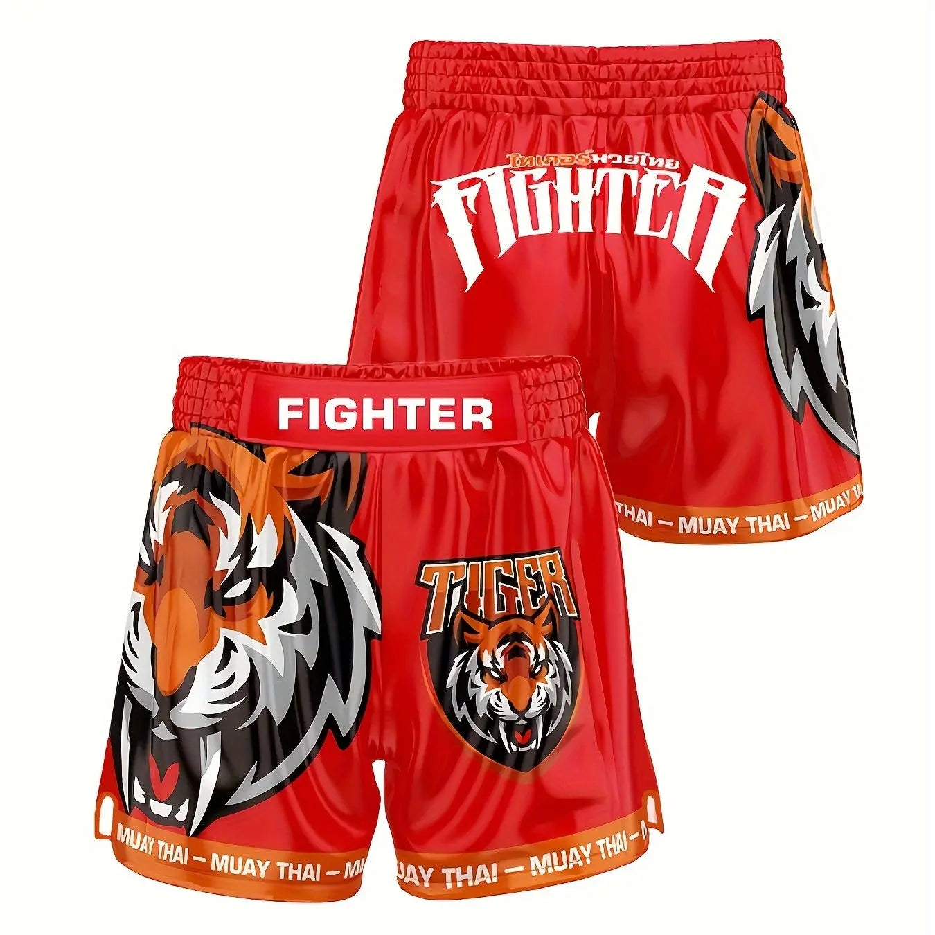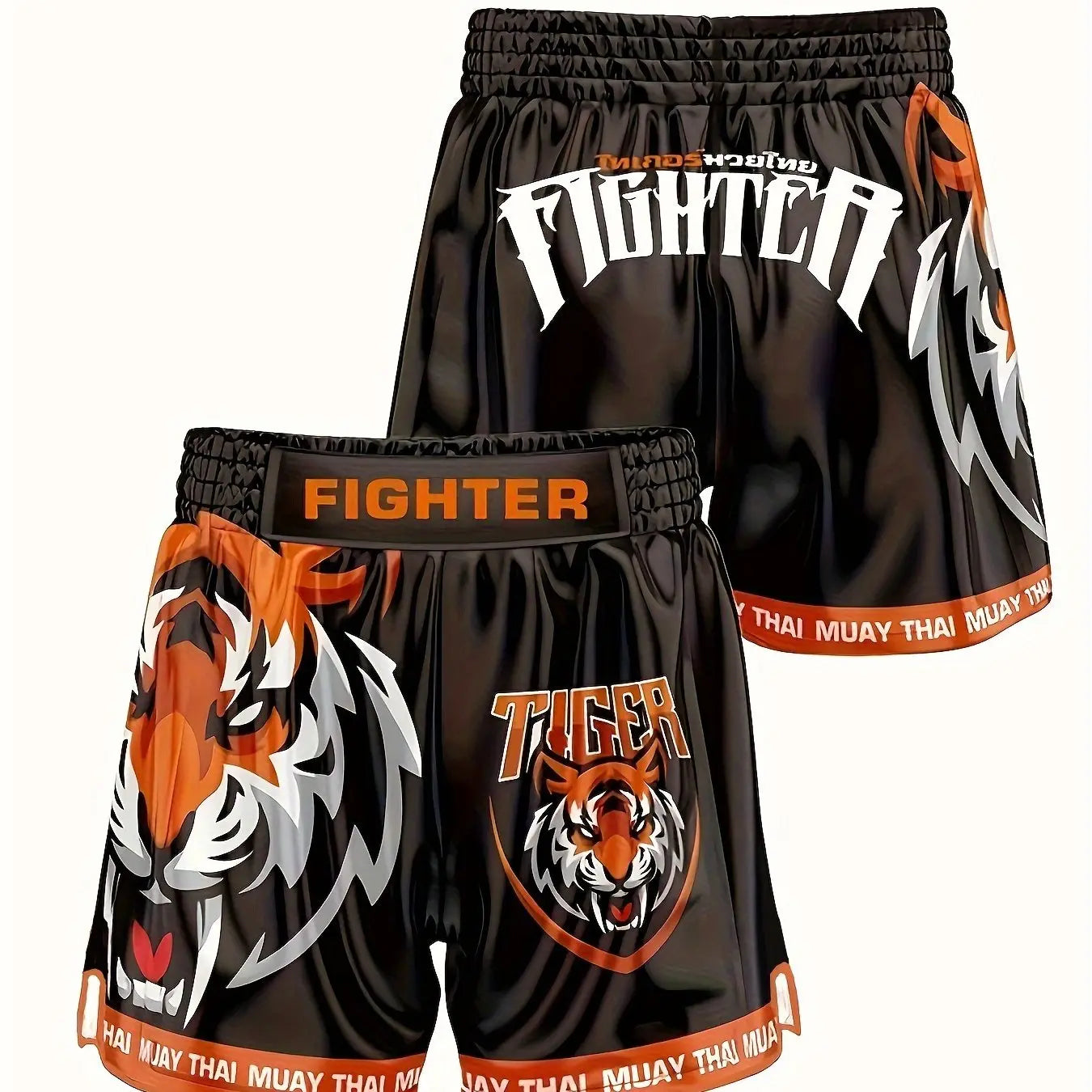 Mens Tiger Warrior Muay Thai Training Shorts - Quick-Dry, Lightweight, Comfortable, Medium Stretch, Cartoon Patterned, Split Design, Regular Fit, Polyester Combat Sports Shorts for Men, Teen, and Universal - Ideal for Sports, Martial Arts, Running, Traini