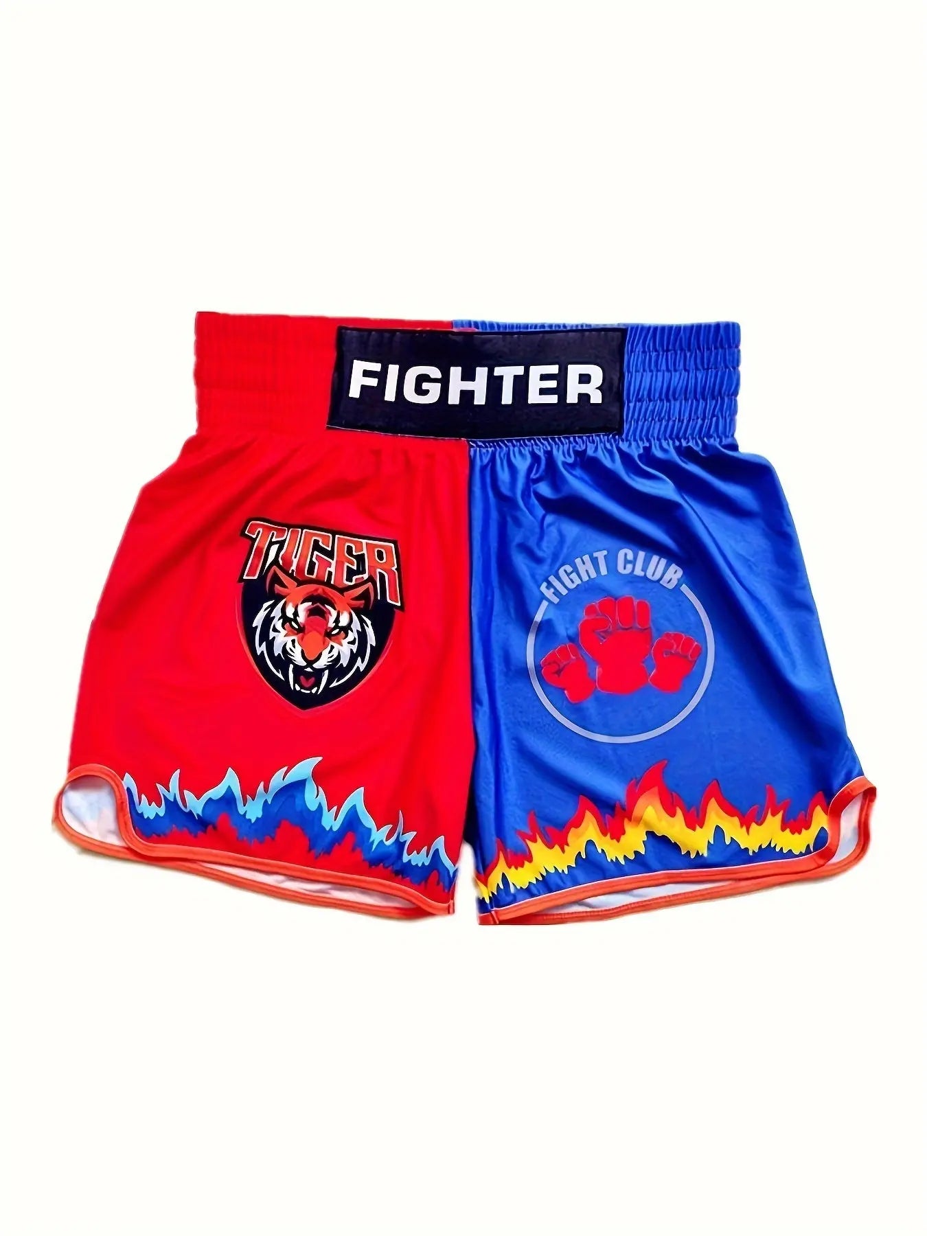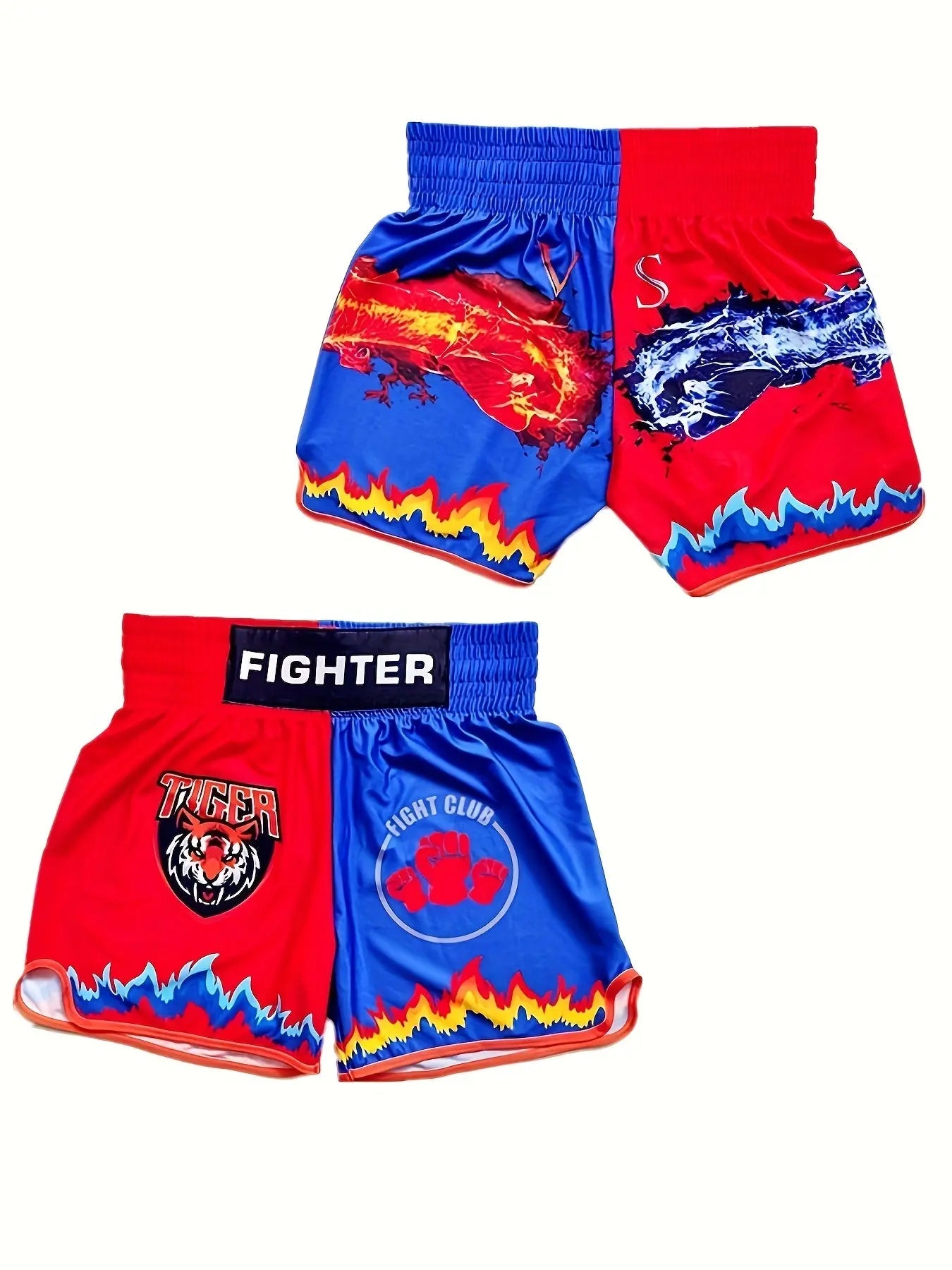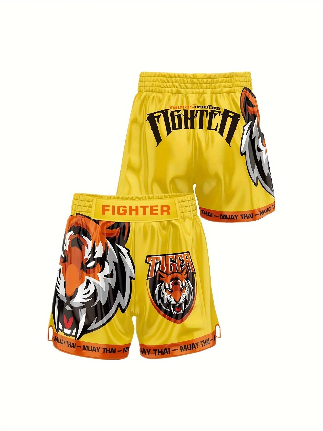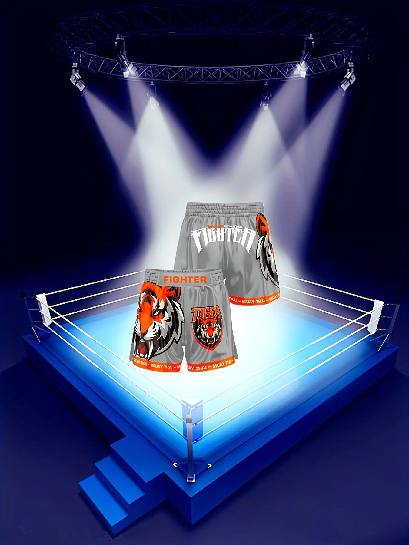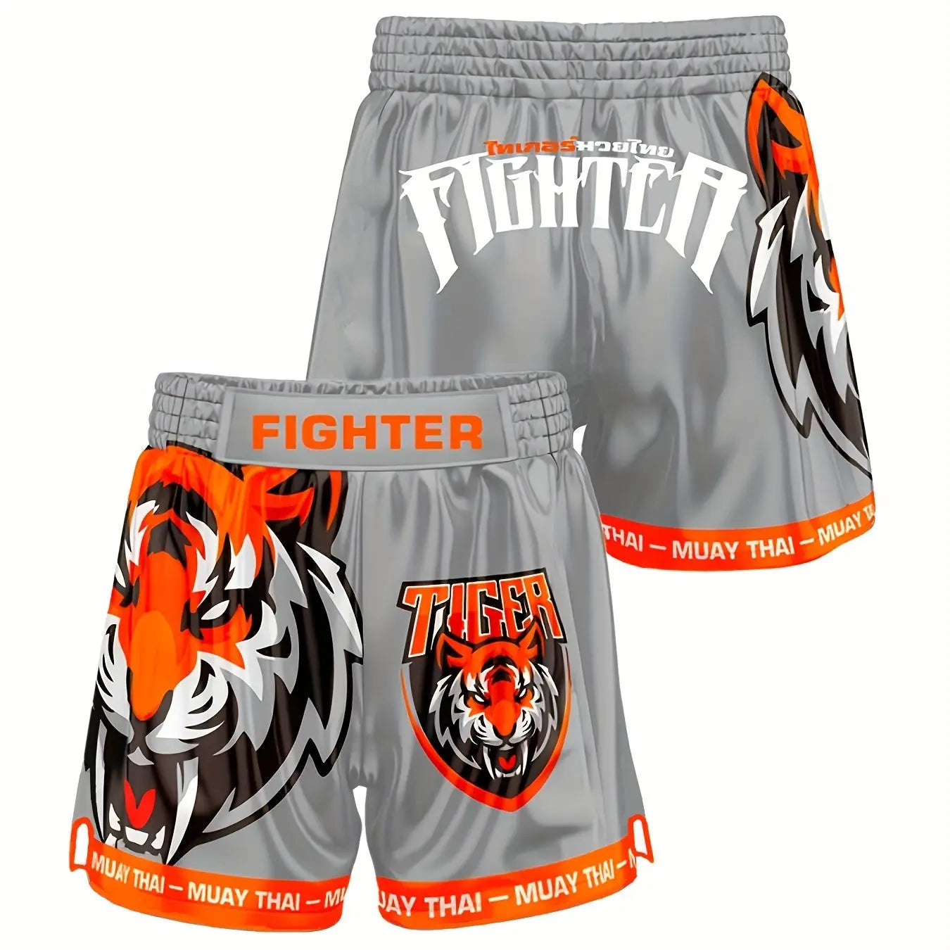 Mens Tiger Warrior Muay Thai Training Shorts - Quick-Dry, Lightweight, Comfortable, Medium Stretch, Cartoon Patterned, Split Design, Regular Fit, Polyester Combat Sports Shorts for Men, Teen, and Universal - Ideal for Sports, Martial Arts, Running, Traini